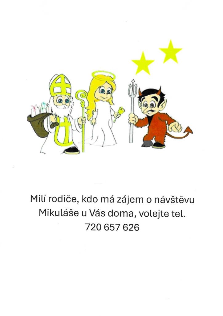 Milí rodiče, kdo má zájem o návštěvu Mikuláše u Vás doma, volejte tel. 720 657 626