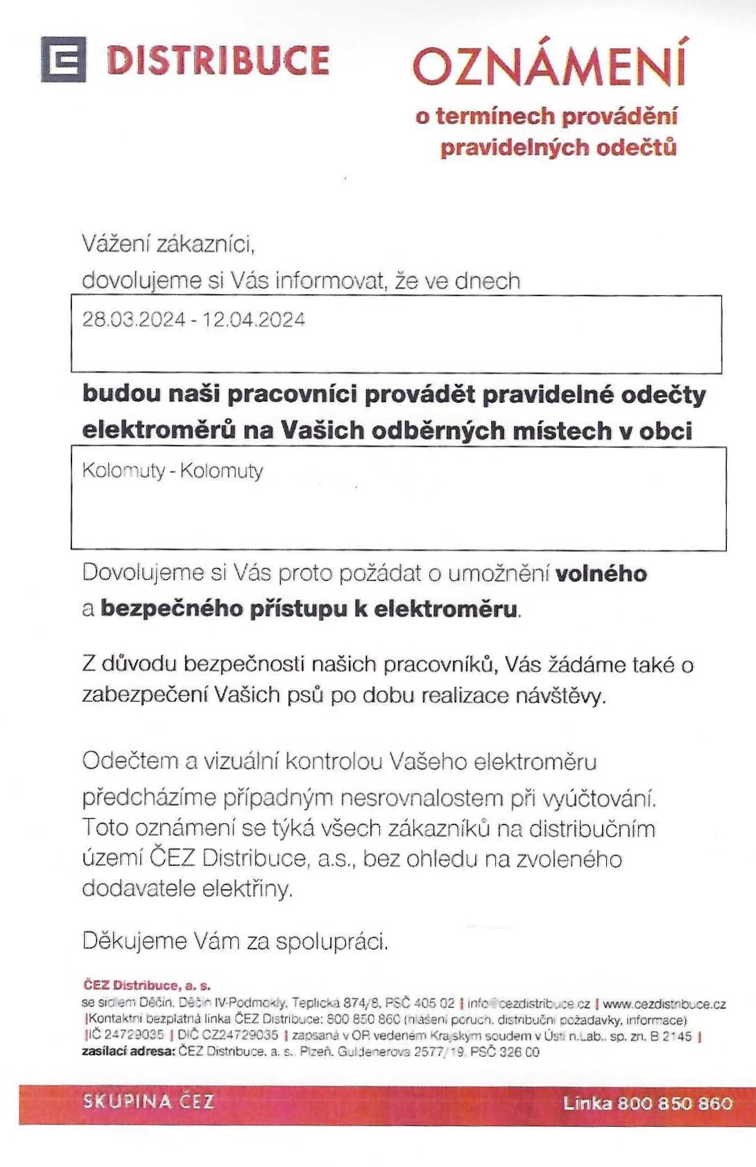 Dovolujeme si Vás informovat, ze pracovníci ČEZ Distribuce budou ve dne 04.04.2024 provádět v naší obci pravidelné odečty elektroměrů. OÚ Kolomuty