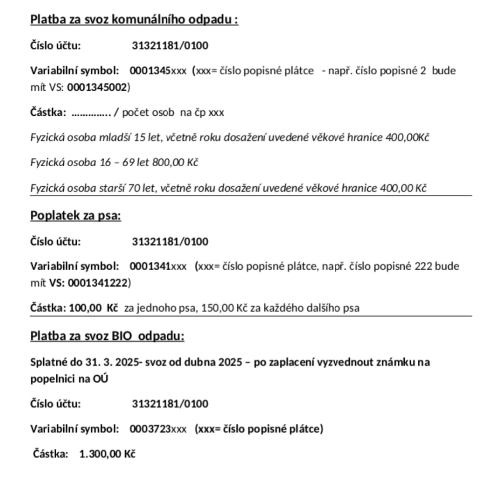 poplatky za svoz komunálního odpadu, BIO a poplatky za psy plaťte prosím bezhotovostně dle pokynů v příloze, příp. můžete zaplatit hotově na OÚ každé pondělí od 17 – 19h, nová známka na popelnici je nutná od února.