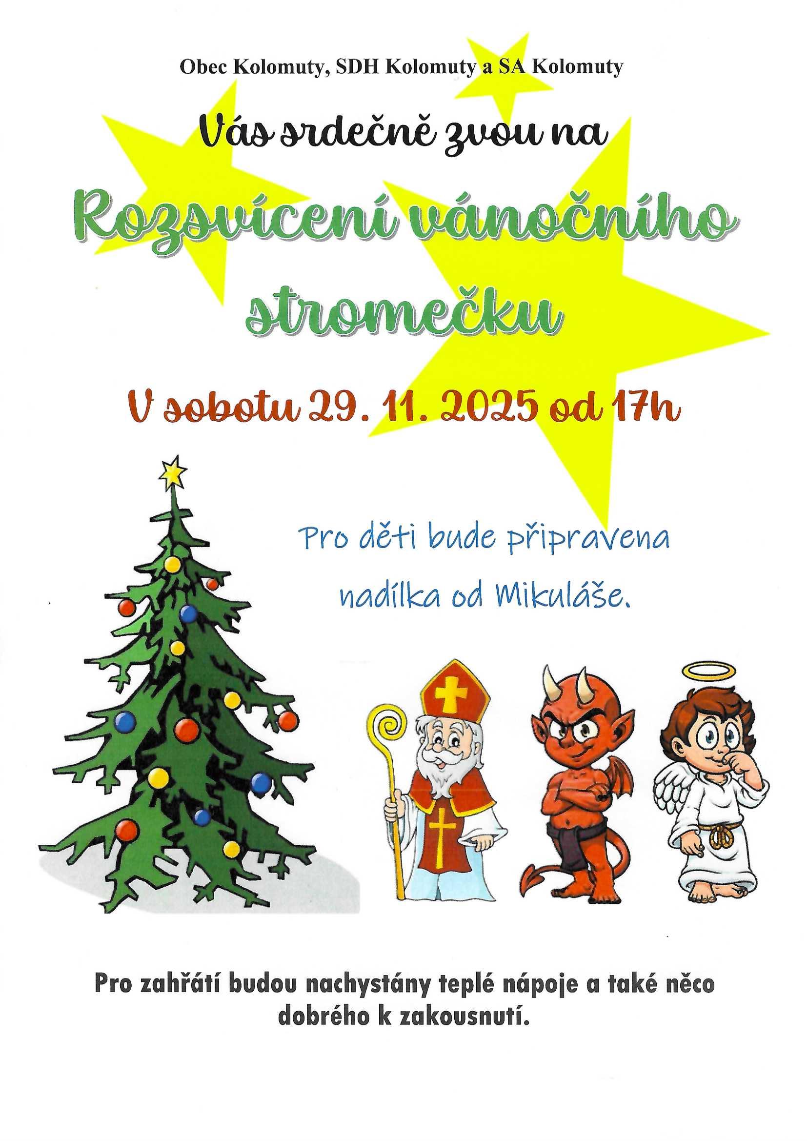 V sobotu 29. 11. 2024 v 17h. Pro deti bude pripravena nadilka od Mikulase. Pro zahrati budou nachystany teple napoje a take neco dobreho k zakousnuti.