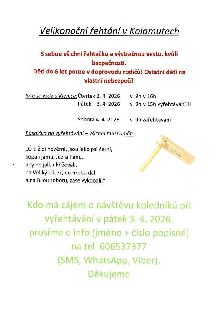Kdo má zájem o návštěvu koledníků při vyřehtávání v pátek 3. 4. 2026, prosíme o info (jméno + číslo popisné) na tel. 606537377(SMS, WhatsApp, Viber).Děkujeme